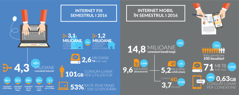 Prin conexiunile fixe, utilizatorii români au generat în primul semestru al anului 2016 un trafic total de download și upload de 2,6 milioane TB, cu un consum mediu lunar per utilizator de 101 GB, în timp ce prin intermediul echipamentelor mobile au efectuat un trafic de 0,07 milioane TB, traficul mediu lunar per conexiune mobilă aproape dublându-se față de primul semestru din 2015, de la 0,33 GB la 0,63 GB.