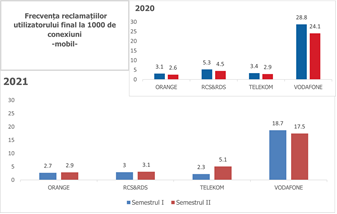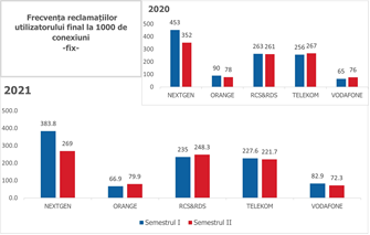 Numărul reclamațiilor înregistrate în anul 2021 la o mie de conexiuni active pentru principalii furnizori de servicii de acces la internet la punct fix a scăzut, încadrându-se între 67 și 384 de reclamații în funcție de furnizor. De asemenea, și în cazul serviciilor de acces la internet mobil, numărul reclamațiilor înregistrate la o mie de conexiuni active este în scădere și se încadrează în intervalul 2–19 reclamații.