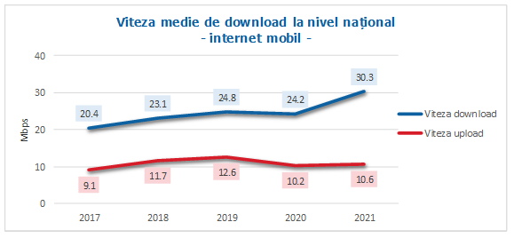 Rezultatele testelor efectuate de utilizatori pe platforma Netograf indică o viteză medie de download la nivel național pentru internetul mobil de 30,3 Mbps, în creștere cu 25% față de anul trecut, respectiv o viteză medie de upload de 10,6 Mbps pentru internetul mobil la nivel național pe parcursul anului 2021, păstrându-se constantă față de 2020.