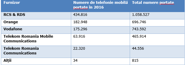 În anul 2016, furnizorii de telefonie mobilă au atras prin portare 879.330 de utilizatori, respectiv 94% din totalul utilizatorilor portați în anul 2016. Cei mai mulți utilizatori care s-au portat în anul 2016 au optat pentru rețeaua RCS & RDS – 434.816, în timp ce Orange a primit prin portare 182.948 de utilizatori, Vodafone – 175.296, Telekom Romania Mobile Communications – 63.916, iar Telekom Romania Communications – 22.320.