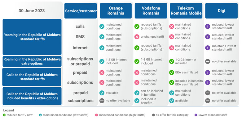 4 August 2023 WARNING! In the context of the holiday period, ANCOM recommends that users planning trips to the Republic of Moldova check their provider’s tariffs for roaming internet in the neighbouring country, before relying heavily on this service during the trip. Although the vast majority of tariff plans offered by Romanian operators for roaming internet in the Republic of Moldova feature low, competitive tariffs, some customers with older contracts or tariff plans that have not been updated may be exposed to high costs, similar to the standard rates from previous years. Such situations can be avoided by updating the subscription contracts signed before 12 July 2019 or by activating, before the trip, an extra-option with very low internet prices for the Republic of Moldova, such extra-options being applicable for both subscriptions and prepaid cards.